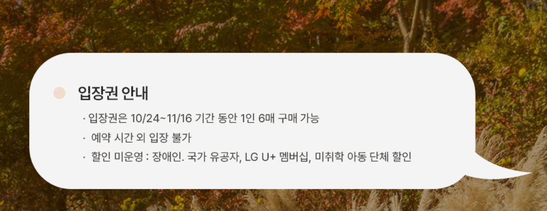 - 예매는 100% 사전 예약제로, 방문 희망일 최소 1주일 전에는 예약을 권장합니다.